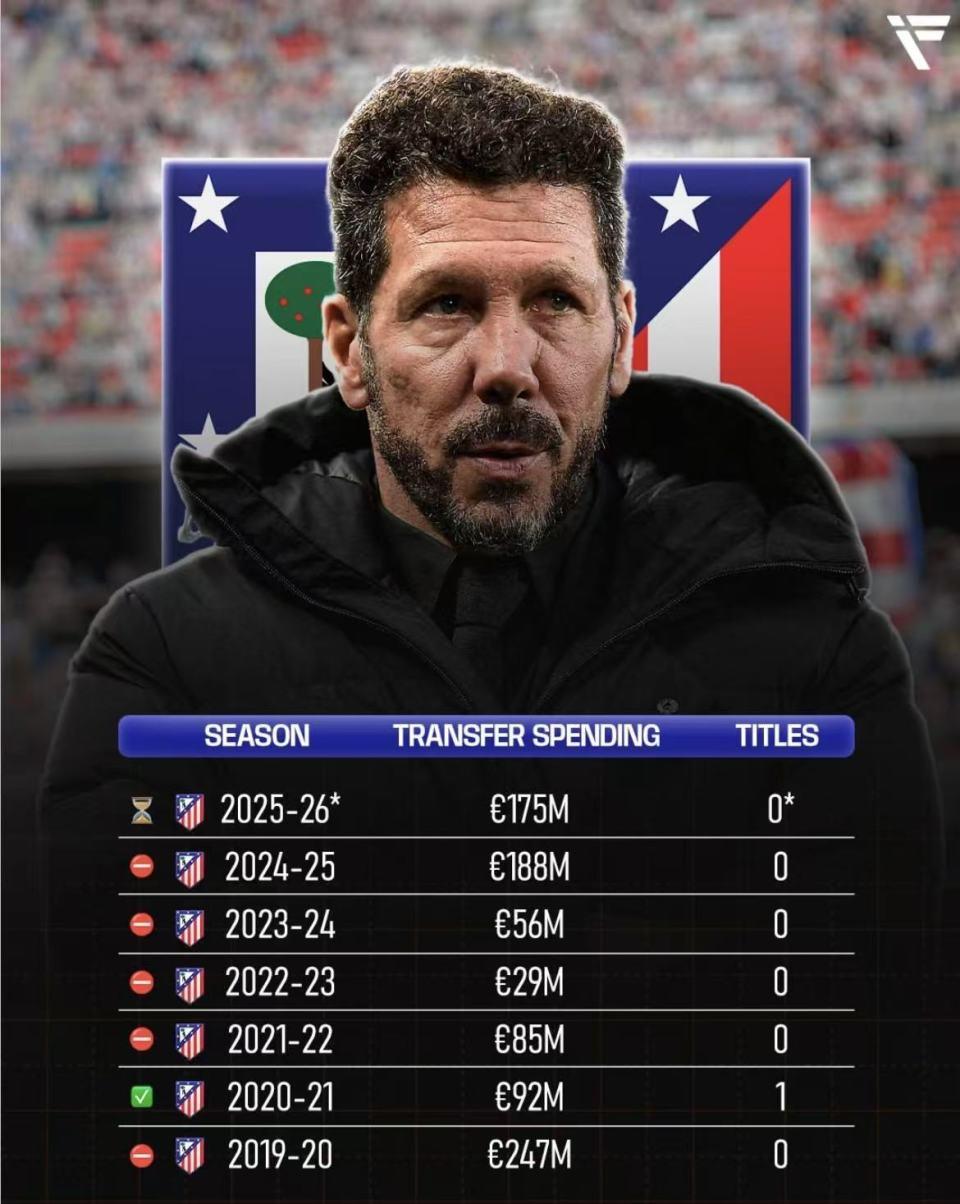 2025-26(进行中):联赛开局3轮2分,为西蒙尼时期较差的开局之一。