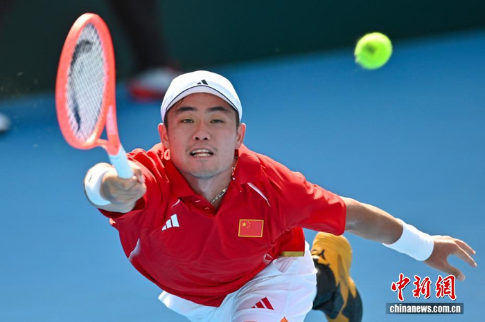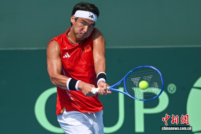 2月6日,为期两天的2026年戴维斯杯世界Ⅰ组附加赛在广州南沙开赛。中国队派出布云朝克特、吴易昺、周意、商竣程、张之臻在内的阵容主场对阵葡萄牙队。图为中国队布云朝克特在比赛中。中新社记者 陈骥旻 摄