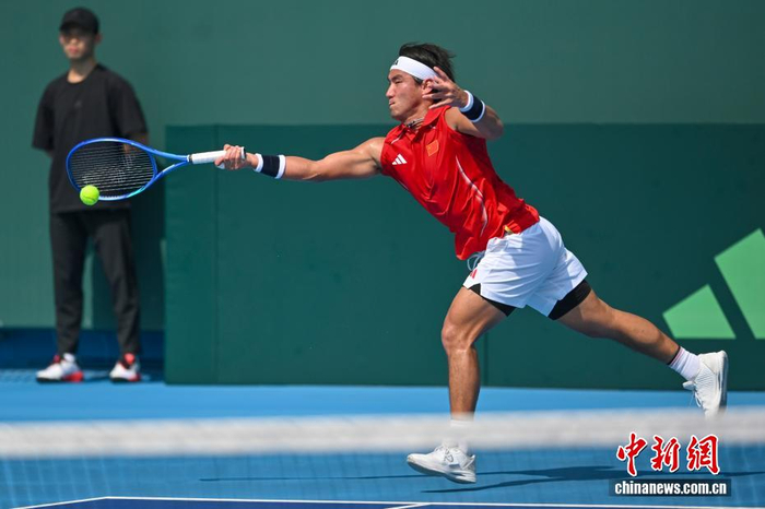 2月6日,为期两天的2026年戴维斯杯世界Ⅰ组附加赛在广州南沙开赛。中国队派出布云朝克特、吴易昺、周意、商竣程、张之臻在内的阵容主场对阵葡萄牙队。图为中国队布云朝克特在比赛中。中新社记者 陈骥旻 摄