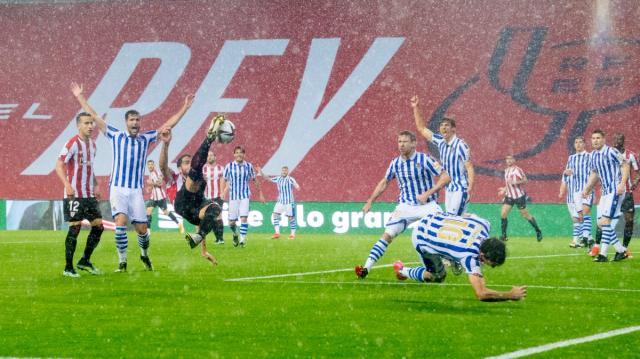 毕尔巴鄂方面阵容相对齐整,而皇家社会面临多个位置主力缺阵。然而真开打后,有“雄狮”称号的毕尔巴鄂发现对方的决心体现在了行动中。向来崇尚技术流、较少身体对抗的皇家社会整场凭借发狂的拼抢和战术犯规牢牢掌控住了中场,在中前场断下皮球就立刻打出快攻。毕尔巴鄂的战术执行相当僵硬,在对方全场围抢的压力下依然寻求地面倒脚配合,一次次将球传进对方包围圈内,传接成功率惨不忍睹。这样不但防线疲于奔命,体能消耗巨大,前场水平最高且配合熟稔的攻击群穆尼亚因、威廉姆斯和劳尔·加西亚基本拿不到球,自然也创造不出进攻机会。